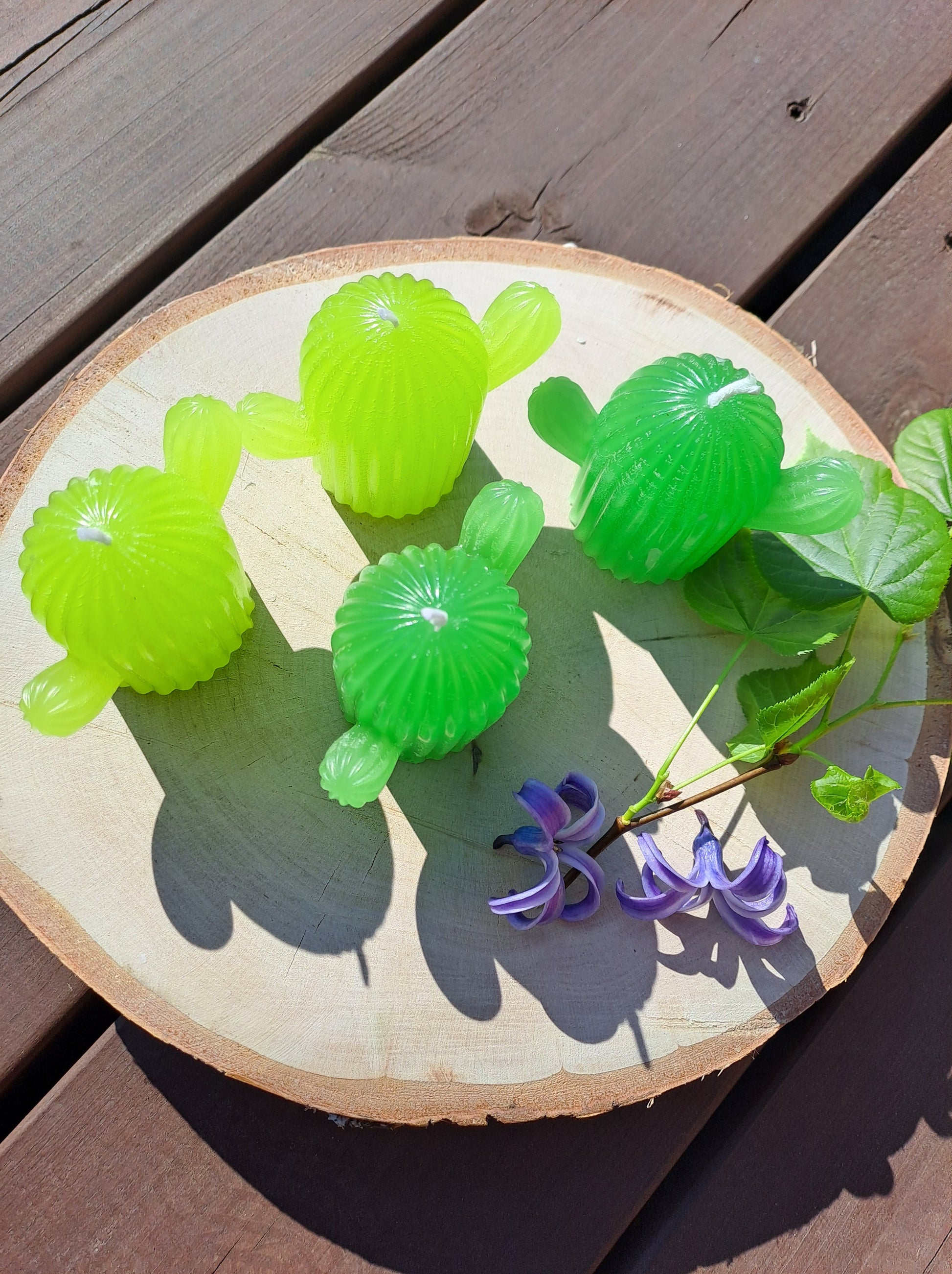 Kaktusa svece pieejama dažādās krāsās ar un bez aromāta. Kaktusa svece izgatavota no parafīna.