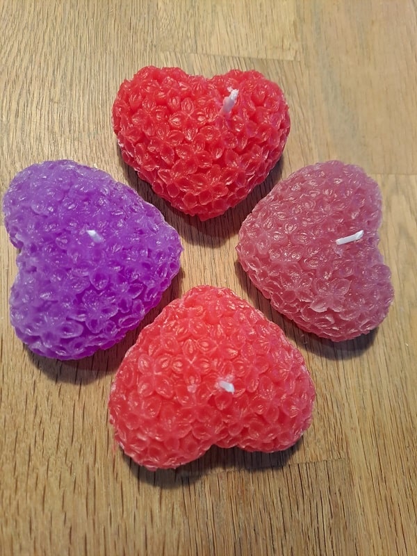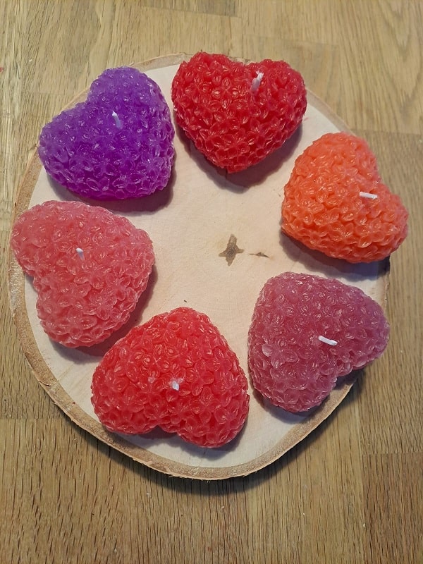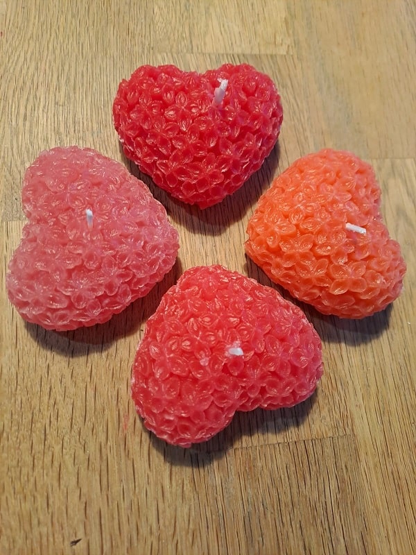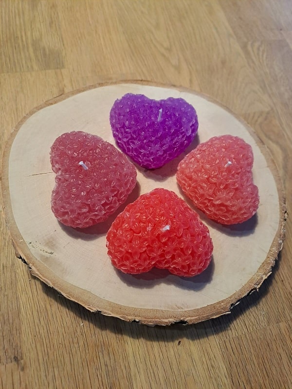 Komplektā 4 sveces - ziedu sirdis (katra 3 cm augsta un 7,5 cm plata, svars ~ 60 g). Svecītes apbur ar burvīgo formu, kā arī rada sirsnīgu un mīļu gaisotni. Piemērota kā simboliska dāvana kādam īpašam cilvēkam.